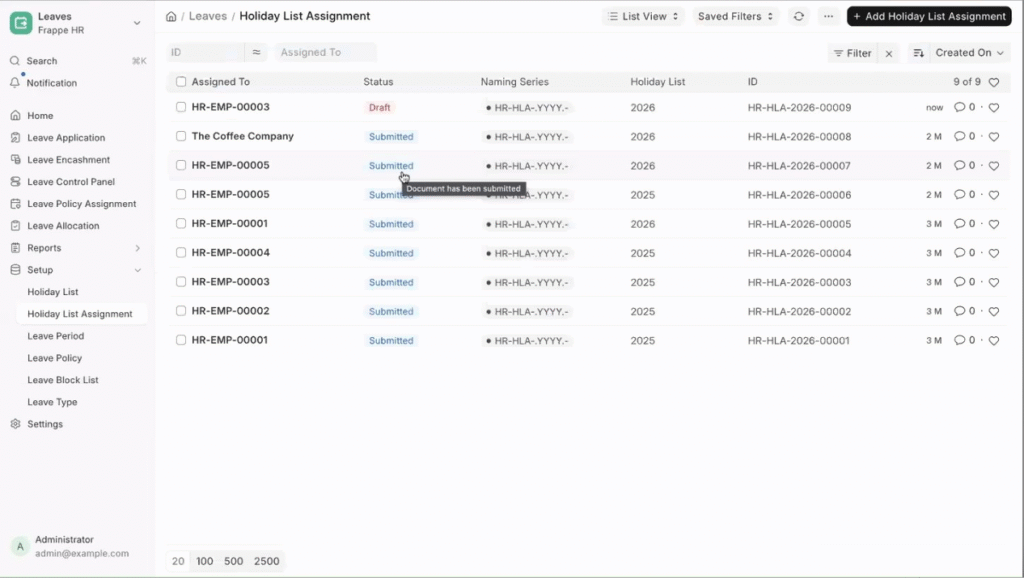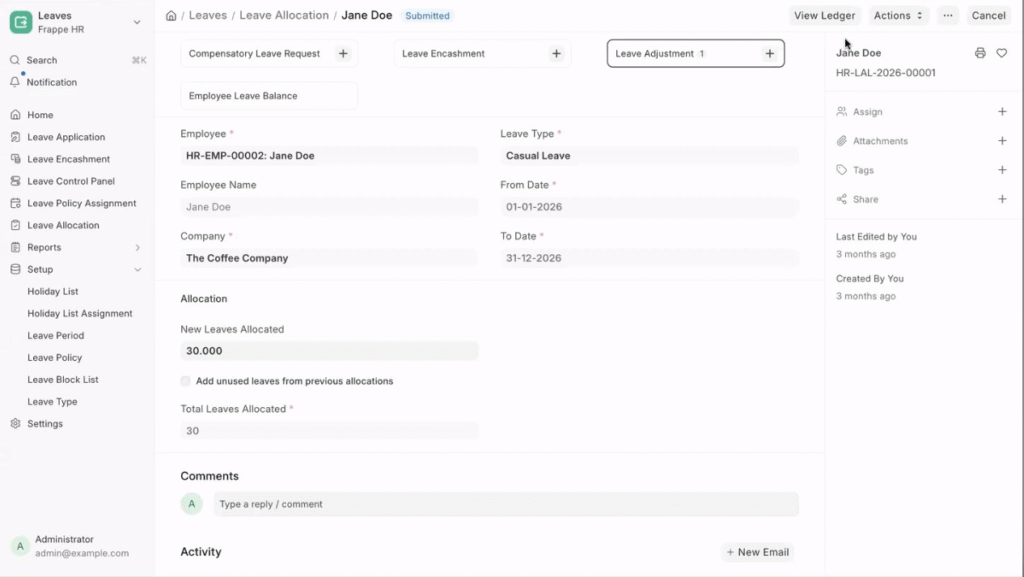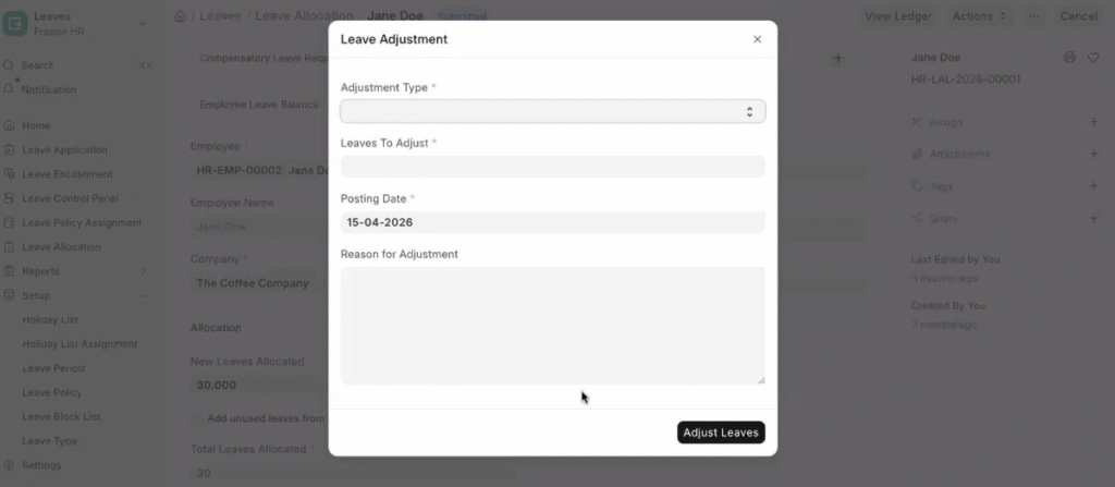 Đây là lý do Frappe HR V16 bổ sung tính năng Leave Adjustment. Tính năng này cho phép HR tăng hoặc giảm số ngày phép giữa kỳ, nhưng không làm xáo trộn các hồ sơ nghỉ phép hay encashment đã có từ trước.
