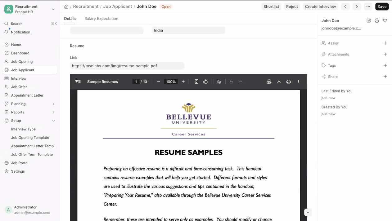 Ngoài phần tạo job opening, luồng xử lý ứng viên cũng được làm gọn hơn. Hệ thống bổ sung các nút thao tác nhanh như shortlist và reject ngay trên form ứng viên. Đồng thời, CV/resume được hiển thị trực tiếp trong hồ sơ, không còn phải sao chép hay mở đi mở lại nhiều nơi.