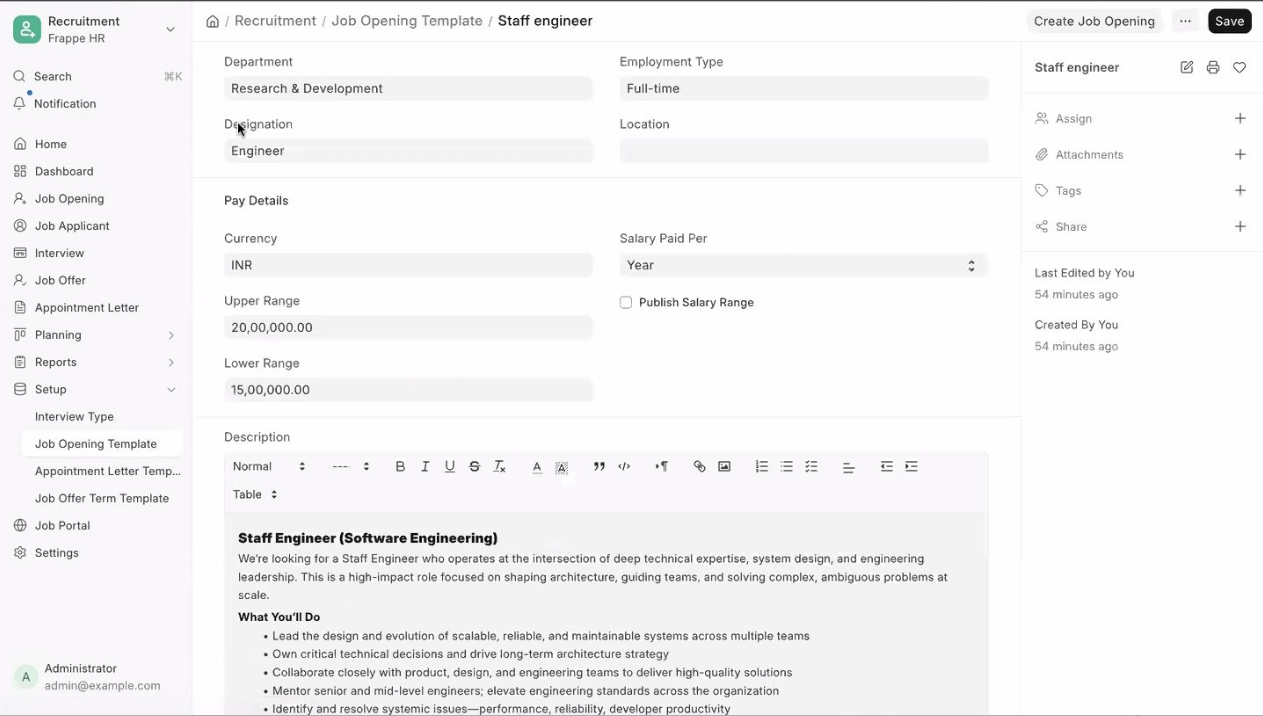 Với tính năng Job Opening Template, HR có thể tạo sẵn mẫu cho các vị trí tuyển dụng thường gặp, bao gồm những thông tin phổ biến như: